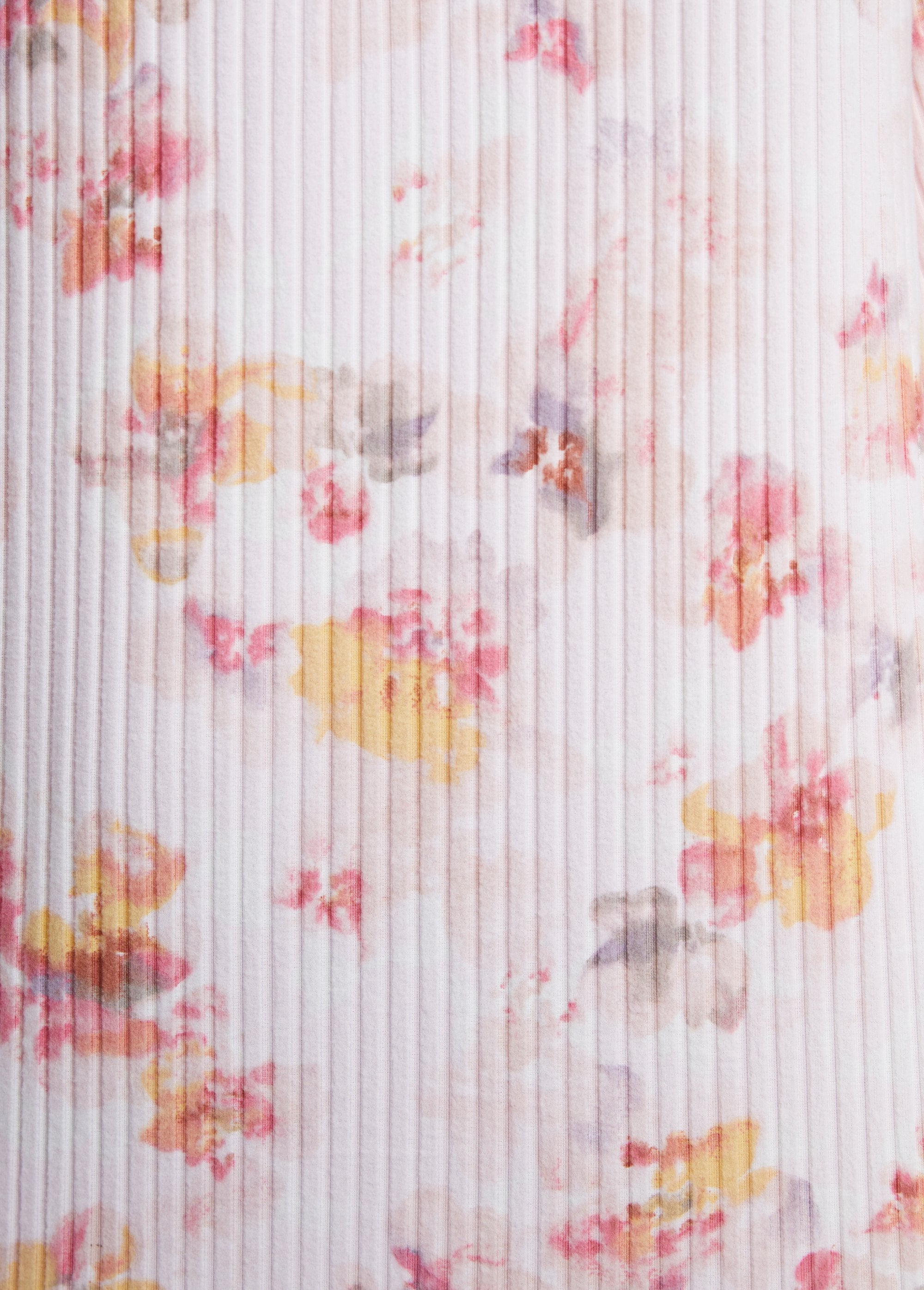 Material de verão por excelência, a malha canelada elástica contribui para o conforto deste roupão de banho estampado com gola quimono. Modelo trespassado, apertado por um cinto liso com presilhas e atilho interior. Bainha lisa adicionada à parte inferior das mangas 3/4 e à parte da frente. Bainha direita com bainha. Toque suave.