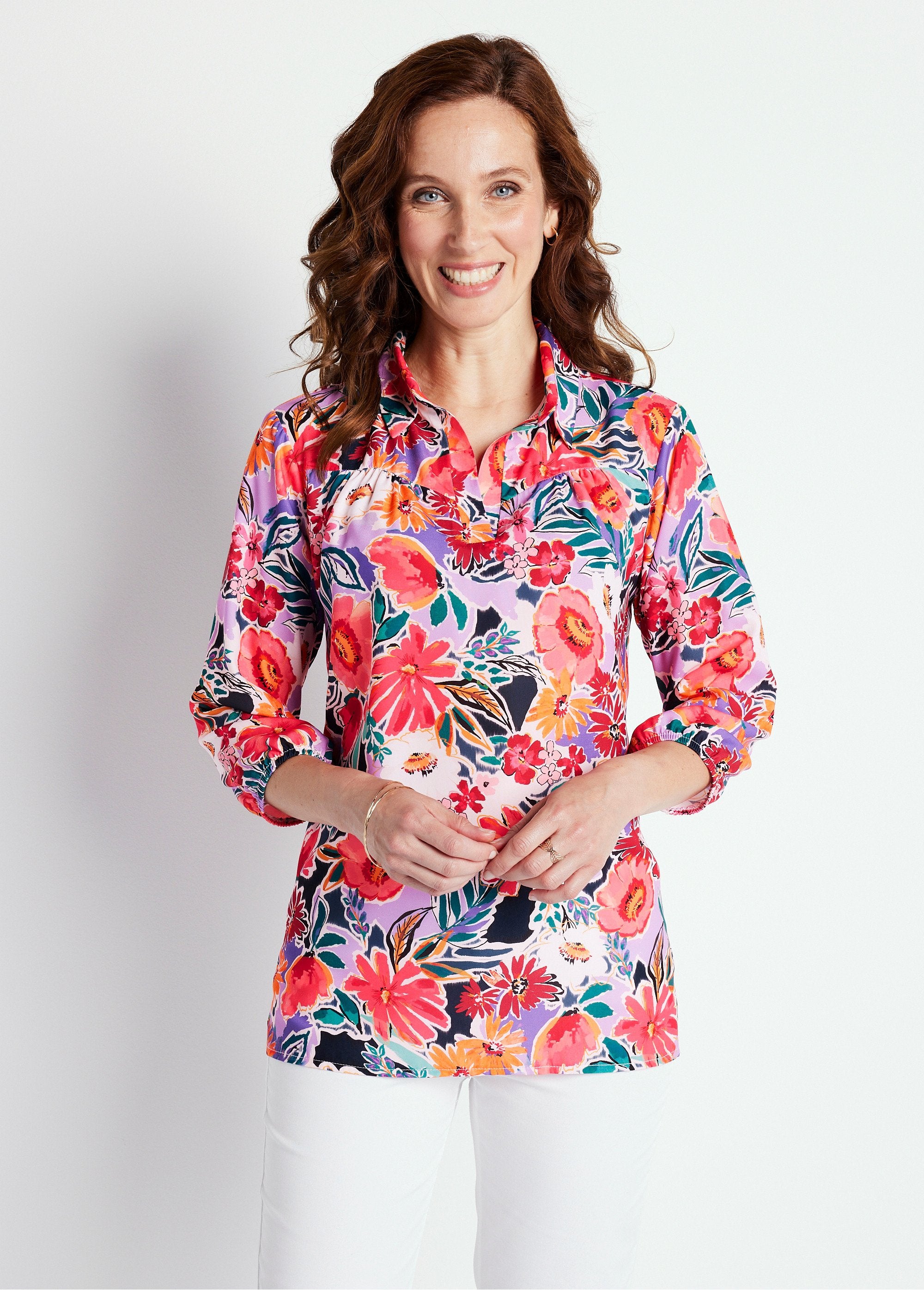 Com sua estampa fresca e brilhante, desperta todos os estilos. Com seu amplo volume, realça todos os tipos de corpo. Uma túnica ideal para acompanhar as calças lisas da estação... Combinação perfeita com a saia LODES para um look totalmente floral!